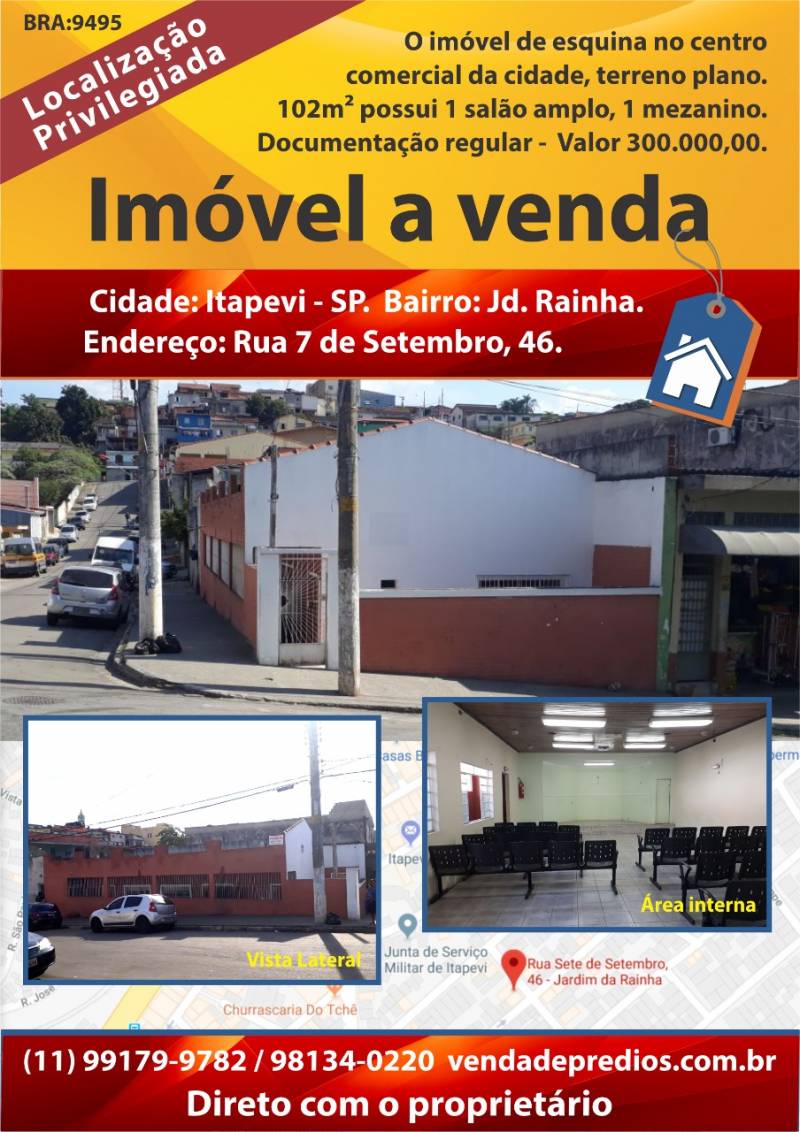 BRA 9495 - Salão Comercial amplo, no centro comercial da cidade. Imóvel de esquina, contendo além do Salão, 2 banheiros e um mezanino. Terreno de 160m² e área construída de 102m². Documentação ok. Pode ser adaptado para escritórios, comércio em geral, academias, igrejas, restaurante ou...